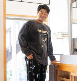 硬派なブランドFLAGSTAFFが、スヌーピーとのコラボで親しみやすい印象に。ベーシックなアイテムと合わせることで、スヌーピーをさりげなく主張させた。デニムの素材感も相まって、より一層アメカジ度が加速するスタイリングに。