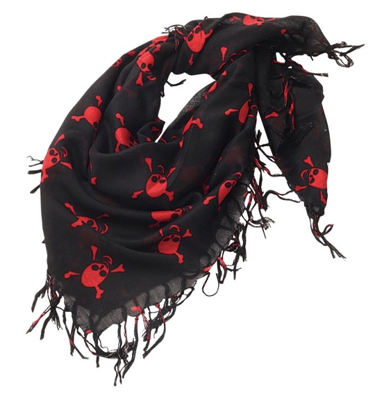 レッドスカルが全面にレイアウトされた、あやしい雰囲気のスカル柄ストール。