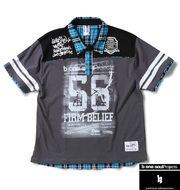 *2枚襟・袖口・裾・前立て部分別布配色/スリット有/フェイクレイヤード/チェック使い/プリント(ラバー)