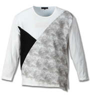 ぼかし模様のプリントと無地のモノトーンの生地が大胆に斜めに切り替えられたデザインが特徴的なin the atticのTシャツ。