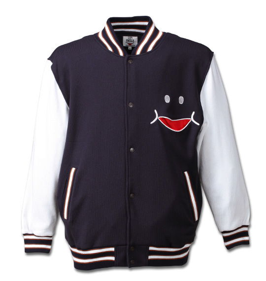 ネイビー×白のスタジャン。胸のマークがさりげなくにっこりアピール。